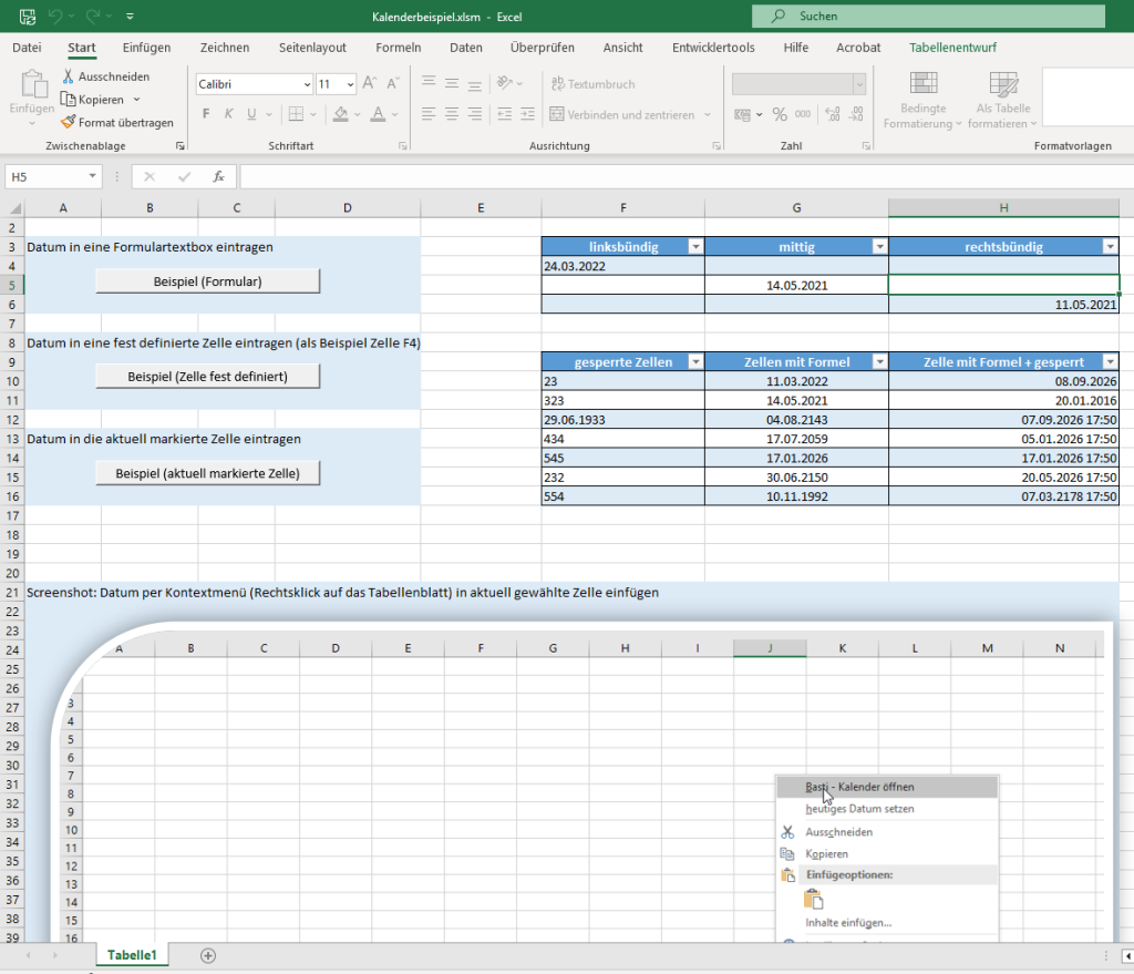 Neben der initialen Formularverwendung und der Umsetzung per Button direkt auf eine Zelle eines Tabellenblatts, beinhaltet das Beispiel auch die Anwendung des Kalenders über das per Rechtsklick aufrufbare Kontextmenü von Excel. Dieses Feature ist seit Version 1.0.1.2 Bestandteil des Kalendermoduls und macht es möglich entweder das heutige Datum, oder eine Datum durch Auswahl innerhalb des Kalenders, in die aktuell selektierte Zelle eintragen zu können.